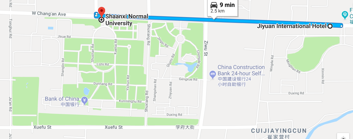 - From Xi'an Xianyang International Airport: take Airport bus Changan District Jiyuan International Hotel line (吉源国际酒店专线) to Jiyuan International Hotel (25 RMB/ each, about 90 min), then take TAXI to Shaanxi Normal University (陕西师范大学)(about 10 RMB, about 5 min)